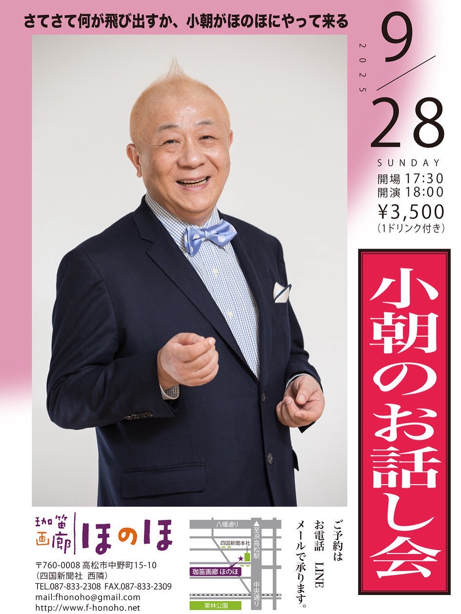 2025年9月28日ほのほ10周年記念イベント【小朝のお話し会】 シェアする ツイート ほのほ10周年記念イベント【小朝のお話し会】 日時 2025年9月28(日) 18時開演 チケット料金 3,500円 (1ドリンク付き) ご予約はお電話、LINE、メールにて承ります TEL:087-833-2308 Mail:fhonoho@gmail.com