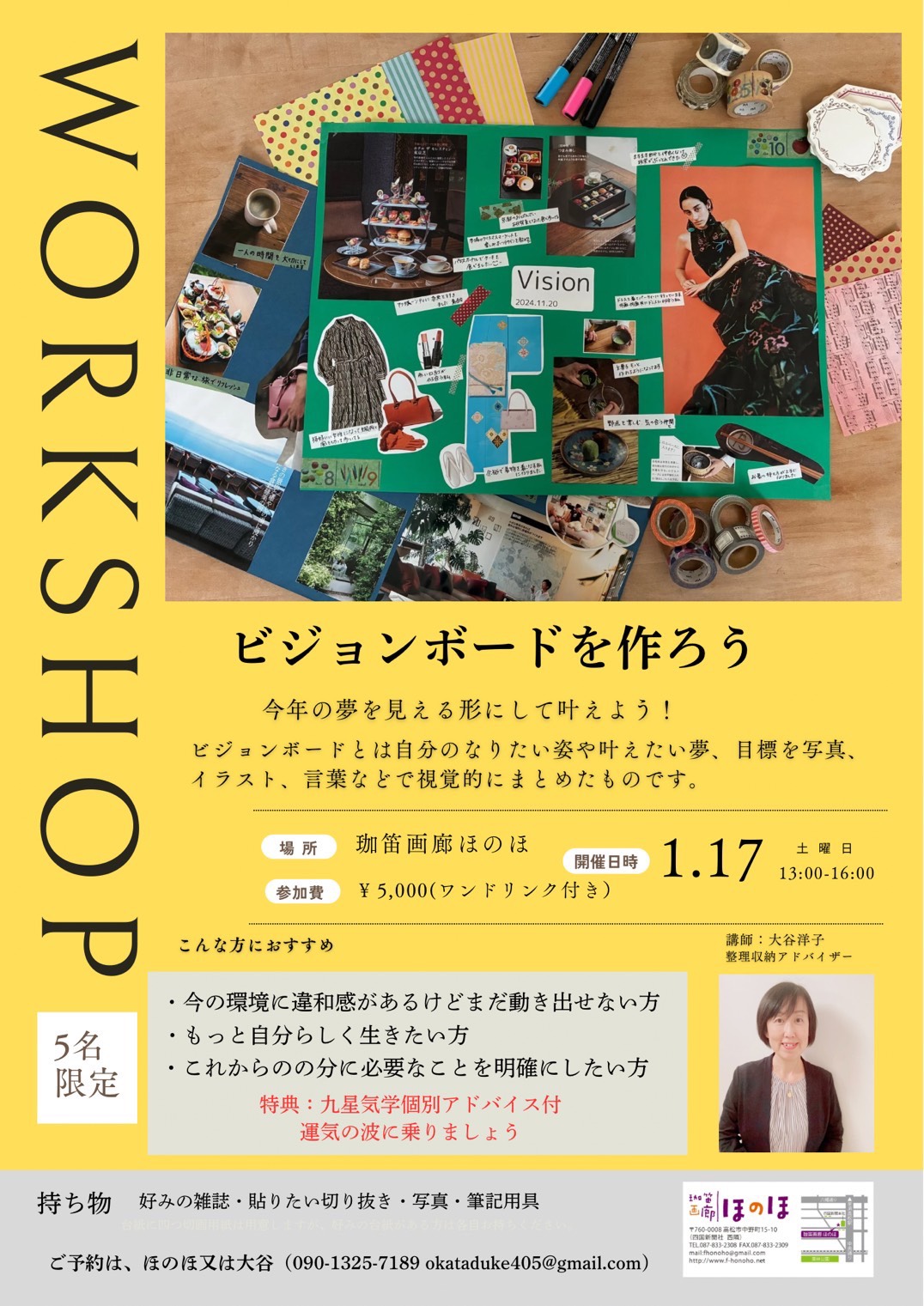 ほのほワークショップ【ビジョンボードを作ろう❗️】 日時 2026年1月17日(土) 13時〜16時 参加費 5,000円(1ドリンク付き) 講師 大谷 洋子 (整理収納アドバイザー) 5名様限定です 👍今年の夢を見える […] |